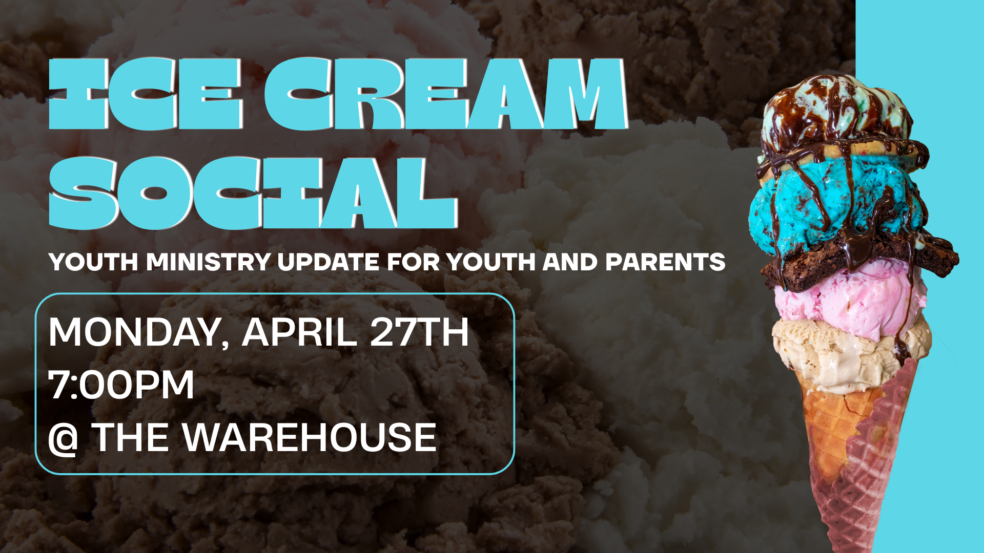 NCC youth and parents, join us for an Ice Cream Social on Monday, April 27th at 7:00pm in the Warehouse! Come and enjoy some ice cream as our pastors and leaders share about exciting new updates about the direction of youth ministry, as well as understand our vision together and be able to ask any questions you might have.