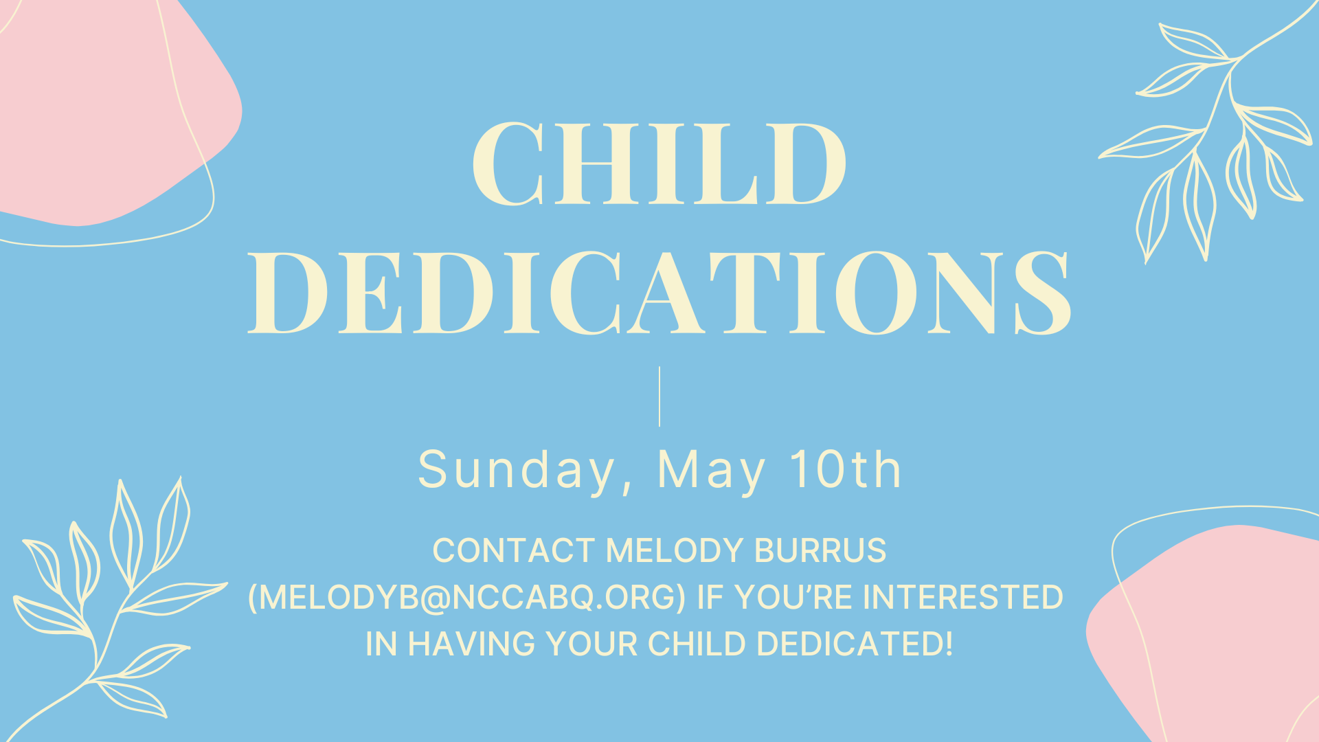We will be having a Child Dedication on Sunday, May 10th during both services! This is a wonderful opportunity for your church family to come alongside you in prayer and support as you raise your little ones to know Jesus and treasure Him. If you are interested in having your child dedicated, please register HERE by May 3rd.