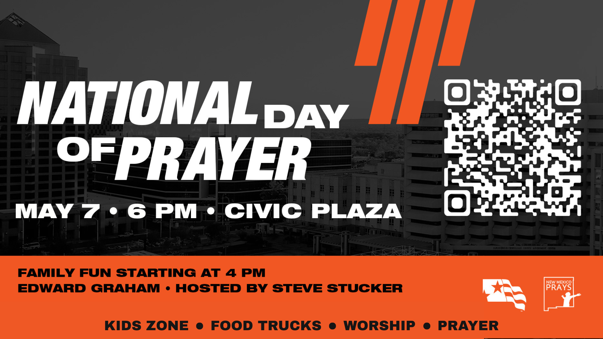 We hope you will join us at the Albuquerque Civic Center on Thursday, May 7th for the National Day of Prayer event! Come and enjoy a fun, family friendly event complete with a kid zone, youth activities, food trucks, along with a time of worship and praise, followed by a united time of prayer for our community, our city, and out nation.